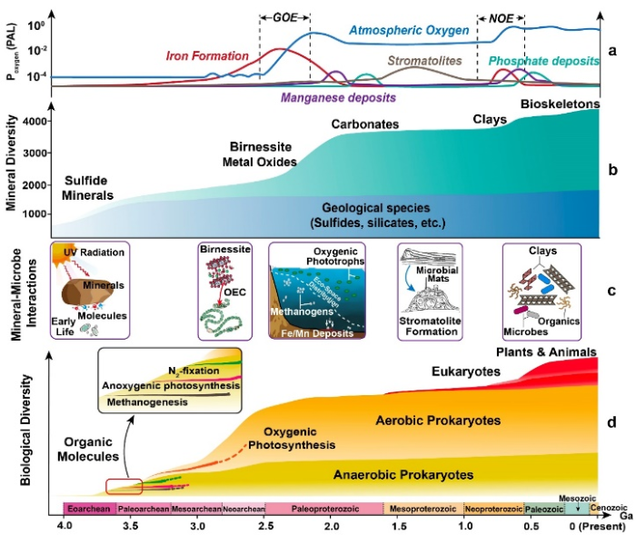 图2. 地球40多亿年间微生物-矿物共演化(a)大气氧化进程、铁锰磷矿床沉积序列以及叠层石沉积变化;(b)矿物种类变化和不同时期关键矿物示例;(c)不同时期关键的矿物-微生物相互作用类型,从左到右:矿物催化和保护早期生命,水钠锰矿促进产氧光合中心出现,氧化环境扩张压缩产甲烷等厌氧微生物生态位,GOE-NOE之间大量形成的叠层石,NOE微生物作用下形成“粘土矿物工厂”保存有机质;(d)微生物种类变化和关键微生物种群示例。