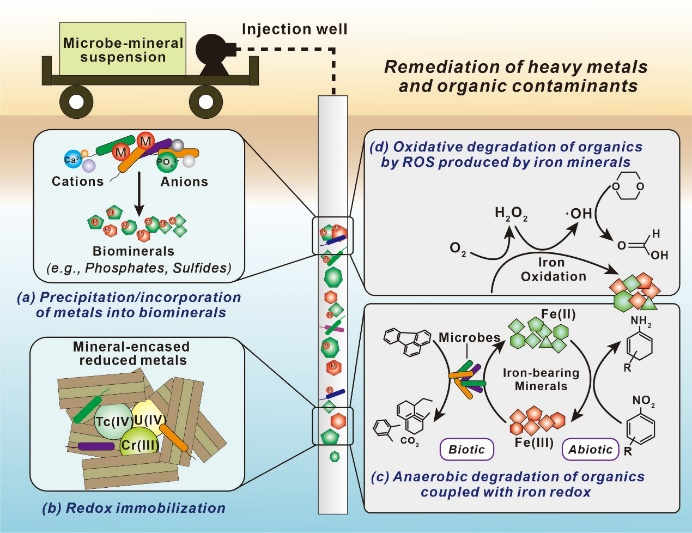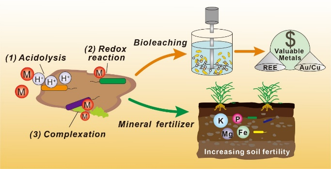 图3. 微生物浸出矿物贵重元素,释放矿物K、P制造矿物肥料(上);微生物-矿物复合剂修复重金属污染和有机物污染(下)。