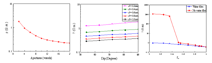 1、结合研究区电成像测井资料建立了不同裂缝开度、裂缝倾角以及不同流体分布的数字岩心模型,通过有限元数值模拟明确了裂缝开度、裂缝倾角以及含水饱和度对岩石电阻率的影响规律(图1)。