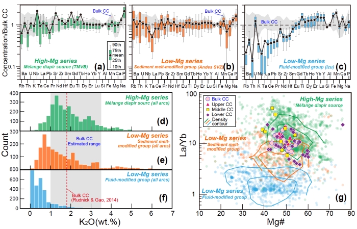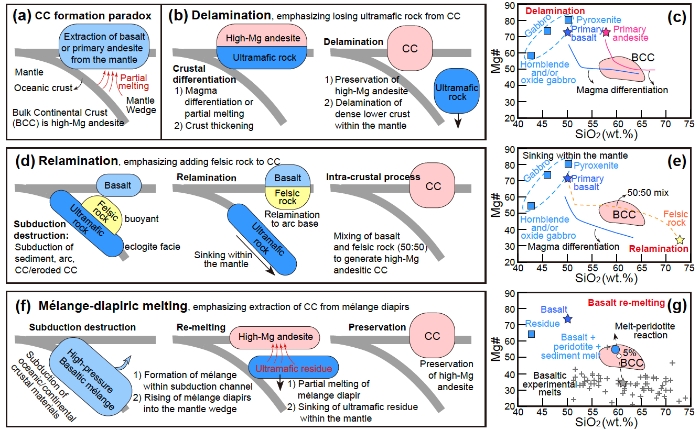 大陆地壳保存了地球岩石圈、大气圈、水圈和生物圈起源和演化的长期记录。理解大陆地壳的形成过程是学术界长期关注的重大基础科学问题之一。在板块构造体系下,原始岩浆弧地壳直接来源于地幔,以玄武质成分为主,不同于高镁安山质?英安质大陆地壳成分。因此需要一个额外的过程,使弧地壳转变为大陆地壳。已有研究表明,镁铁质地壳物质可能通过下地壳拆沉作用(delamination)、俯冲侵蚀(erosion)和长英质岩石刮垫作用(relamination)、再循环地壳物质在地幔中熔融等过程进入地幔,实现地壳整体成分的转变。但哪种过程主导了大陆地壳的形成仍然存在争议。