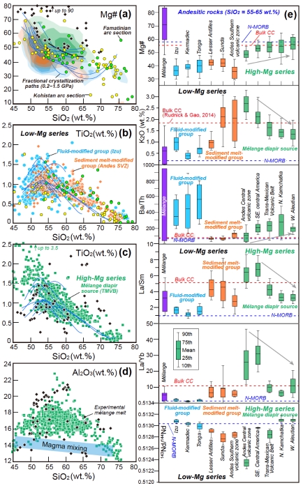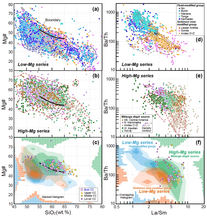 (2)低镁系列可以进一步划分为高Ba/Th组和高La/Sm组,可能分别起源于流体和沉积物熔体交代地幔楔的部分熔融,并伴随着显著的岩浆结晶分异。高镁系列具有高硅、高镁、高Ba/Th和高La/Sm的特征,俯冲再循环地壳物质底辟进入地幔楔并发生重熔可能是高镁系列形成的主要机制。