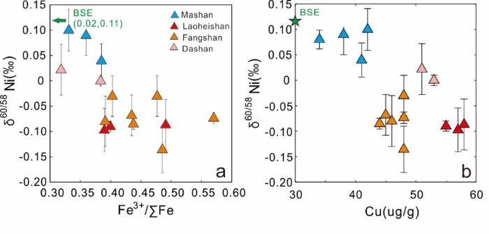 图3 霞石岩Ni同位素与Fe3+/ΣFe (a)和Cu(b)的相关性