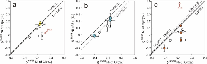 图4 北岩地区地幔包体中单矿物(彩色)及已报道数据(白色)的Ni同位素分馏图解。图中虚线分别为900°C与1350°C时计算出的单矿物-单矿物Ni同位素平衡分馏线