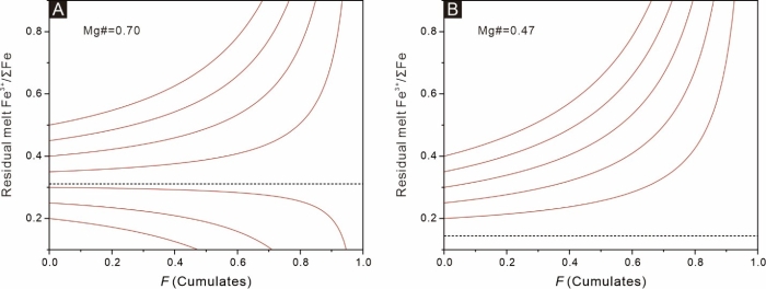 (3)含角闪石堆晶的Fe3+/∑Fe随岩浆的演化呈现出降低趋势,这使得残余熔体中的Fe3+/∑Fe会随岩浆演化而增加,表明了角闪石对于弧岩浆氧化属性具有控制作用。