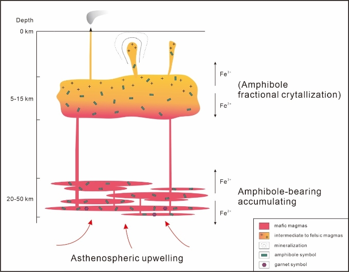 弧岩浆被认为是大陆地壳形成的主要贡献者,通常具有比洋中脊玄武岩(MORB)更高的氧逸度,但这种氧化属性究竟是来自于地幔楔源区还是在其上升演化过程中逐步形成还未有定论。铁(Fe)作为地壳中丰度最高的变价元素,其价态的变化可以控制岩浆的相对氧化还原状态,而富Fe矿物的分离结晶则可以改变残余熔体的Fe价态。角闪石作为弧岩浆体系中最为常见的富Fe矿物相,其分离结晶是否会导致弧岩浆氧化还原状态的改变目前还不清楚。
