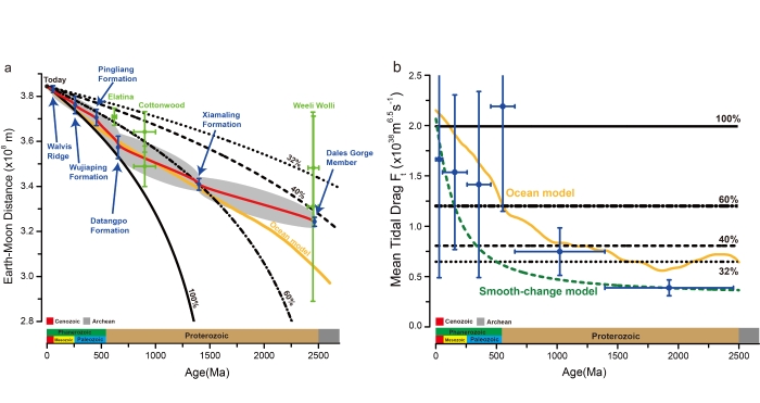 与地月动力学参数相关的另一个问题是,目前大部分天文解决方案基于接近现代值的恒定潮汐耗散模型,而该模型对潮汐耗散的过高估计使对月球起源时间的推断不足15亿年,与目前公认的月球起源于约45亿年前的认识相违背。如果月球的起源于45亿年前,则潮汐耗散在大部分地球历史时期应该低于现在的水平。海洋模型等理论计算提出过类似的演化过程,但是缺乏实际证据的支持。根据旋回地层学约束的地月距离演化可以计算潮汐耗散因子的变化,从而对已有潮汐耗散模型的准确性进行评估。