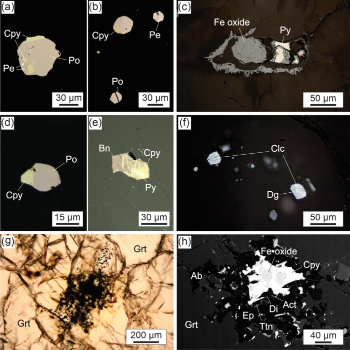 (2)西藏冈底斯弧根岩石含有最高达0.4 vol.%的岩浆硫化物(MSS;1.2-8.3 wt.% Cu),极少量岩浆硫化物蚀变为细粒铁氧化物聚集体;而巴基斯坦Kohistan弧根最初也具有MSS型的岩浆硫化物(7.6-11 wt.% Cu),但变质脱水过程使得大部分硫化物被改造清除,仅有少量富Cu硫化物(8.9-81 wt.% Cu)以包裹体形式保留在石榴子石中。