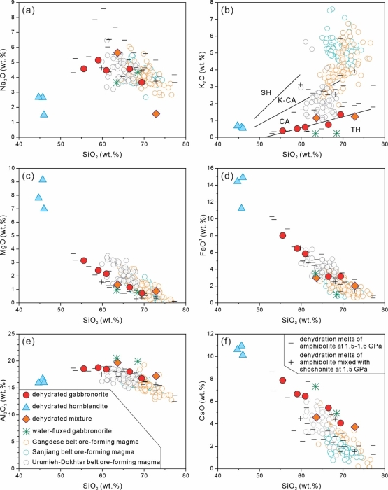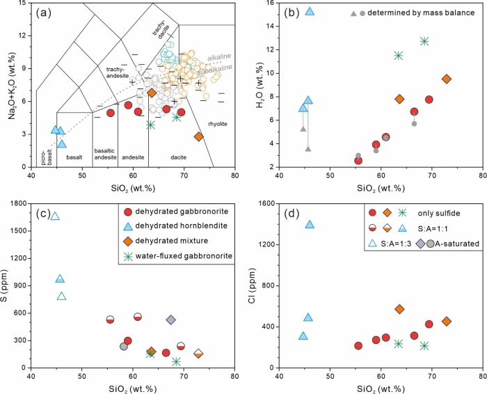 (3)以西藏冈底斯弧角闪石岩和辉长苏长岩以及人工合成硫化物为初始物质,在800-1150 °C、1.5 GPa条件下开展脱水和加水部分熔融实验,实验结果表明产生熔体均具有高La/Yb和Sr/Y的特征且熔体具有大于6 wt.%的水含量,满足成矿所需。但与冈底斯、三江和伊朗碰撞型成矿带典型成矿岩浆相比具有低的K2O、MgO、Cl、S(即使在FMQ+2条件下)含量。