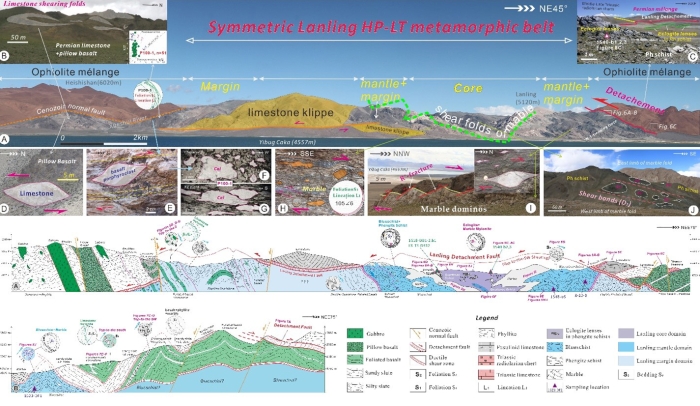 (1)蓝岭低温高压变质岩地体与两侧晚古生代–三叠纪浅变质蛇绿混杂岩以低角度拆离断层分离,榴辉岩及蓝片岩主要呈现5个变形期次,折返期伸展构造呈现变质核杂岩(mcc)样式。拆离断层呈现顶部向W的剪切运动学,榴辉岩及蓝片岩平面上呈现走滑式剪切变形,分别发育顶部向SW及向S的的韧性剪切条带。退变榴辉岩及蓝片岩的岩石学、矿物学分析和视剖面模拟揭示发卡状P–T–t轨迹,同折返期变质矿物剪切条带40Ar/39Ar年龄表明变质核杂岩及核部低温高压变质岩的折返剥露发生在244–215 Ma,早于南羌塘地块(SQB)和北羌塘地块(NQB)的陆陆碰撞。