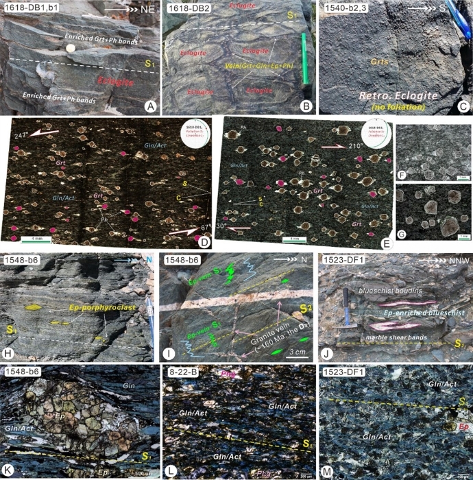 图5. 蓝岭低温高压变质岩地体榴辉岩和蓝片岩露头及显微尺度折返期剪切变形条带(D1)
