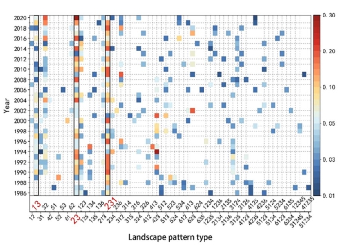 4. 以典型实验区为例,验证了模型的应用效果,获取了实验区景观格局类型(图5)、主导景观格局类型的时空演变规律(图6)。