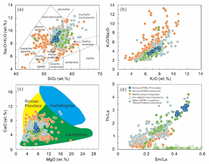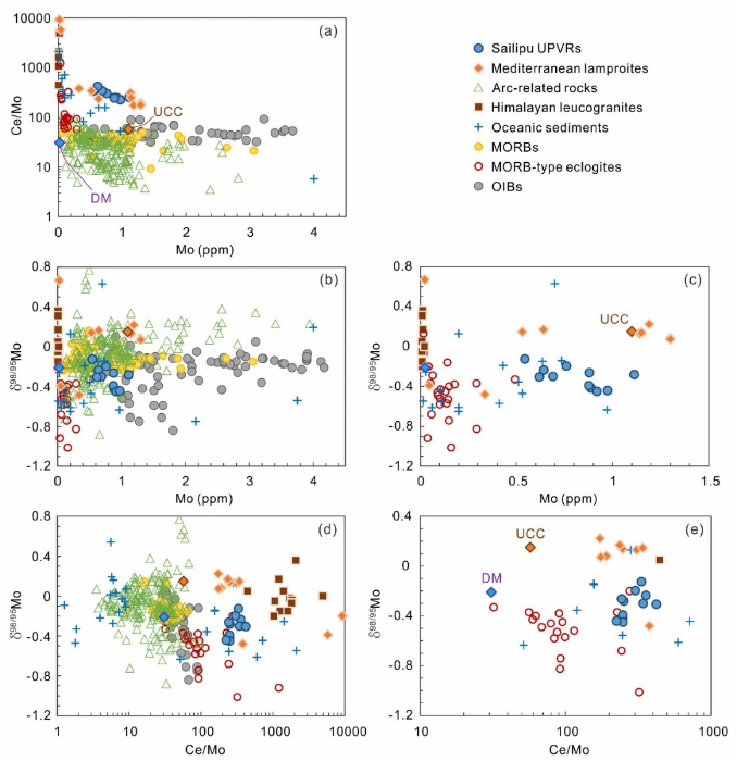 1 赛利普超钾质岩石具有高镁(MgO > 6 wt. %; Mg# ~ 70)和Ce/Mo 比值(225-422)及轻的Mo同位素组成(-0.45‰ 至 -0.13‰ ;图1),它们记录了青藏高原南部岩石圈地幔内部的地球化学组成。