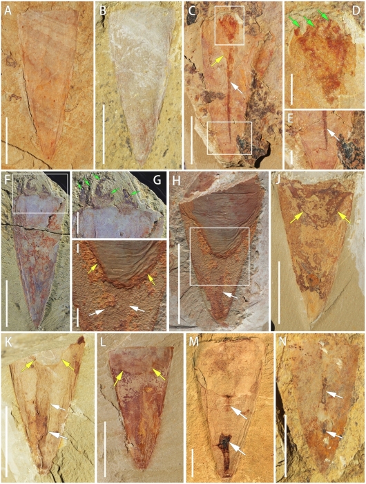 2. 舌形螺(Glossolites)为原始的水母类刺胞动物。除以上形态学新知外,舌形螺内部解剖学特征可与现生钵水母和十字水母的水螅体很好地对比,尤其是舌形螺的软躯体出现明显的萼部-柄部分化,这在水母水螅体中也普遍出现。根据以上解剖学特征,我们将Glossolites论证为具管鞘的底栖水母类刺胞动物,代表水母亚门的基干类群。现代部分水母水螅体世代也有锥管状围鞘,该性状可能为水母亚门的祖先特征。