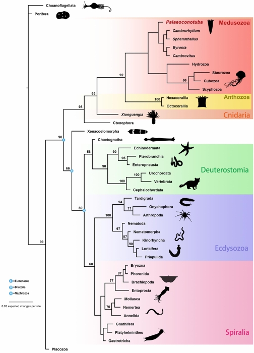 图2 贝叶斯推断法分析认为具管鞘水母类为水母亚门的基干类群