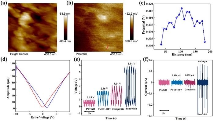 图1(a)KPFM图像,(b)对应的KPFM表面电位图像,(c)1 nN应力下的表面压电势,PVDF-HFP@rGO夹层多孔膜所选线上的表面电位分布。(d)PVDF-HFP@rGO夹层膜的压电-振幅电压曲线。压电薄膜的电输出(2.5 ×2.5 cm2):施加30 N压力时,(e)开路电压和(f)短路电流信号