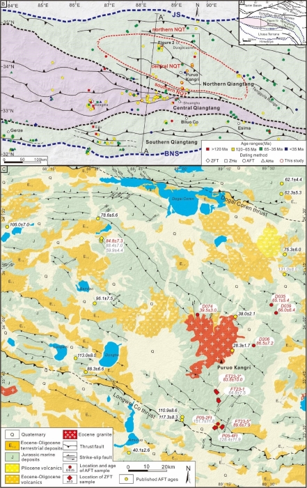 青藏高原作为世界上海拔最高、面积最广的高原,不仅是探究地球动力学和陆-陆碰撞的天然实验室,而且其地表隆升影响着亚洲季风的形成发展、干旱化以及全球气候变化。尽管前人关于青藏高原的隆升历史开展了大量研究,提出其隆升过程在时空上存在显著的差异,然而对其隆升时间和机制仍存在很大争议。如在隆升时间上,存在白垩纪时期、始新世时期以及中新世以来等不同观点;在隆升机制上存在拉萨-羌塘碰撞、新特提斯洋俯冲汇聚、深部下地壳流动以及板片断离等不同认识。羌塘地体位于青藏高原腹地,出露了古生代-新生代沉积地层,受白垩纪拉萨-羌塘地体和古近纪以来印度-欧亚碰撞的影响,构造变形复杂,是研究青藏高原中生代以来地表隆升和剥露过程的理想场所。尽管变形年代学和低温热年代学研究表明羌塘地体在40-35 Ma形成了低起伏的高原地貌,然而对其形成过程和动力学机制一致存在争议。方式演化而来?