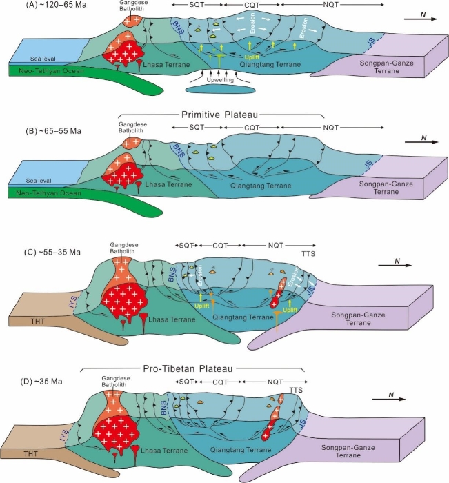(2)第一期的快速快却(120-65 Ma)表现为从羌塘地体中部向南、北发生扩展,结合区域构造事件,提出这一期快速冷却可能与拉萨-羌塘地体碰撞和中羌塘地体的构造负载有关。