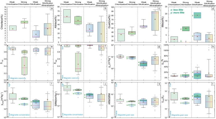图1 不同蚀变与矿化样品的(a)绿泥石、(b)钠长石、(c)石英、(d)伊利石含量与(e-l)岩石磁学参数变化