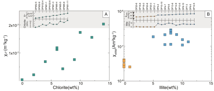 图2(a)矿床中蚀变英安岩的绿泥石含量与χLF呈正相关;(b)伊利石含量与χARM呈正相关