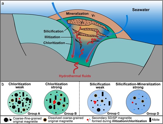 火山成因块状硫化物(VMS)矿床具有重要的工业价值,是全球铜、铅、锌、金、银等多种金属的主要来源之一。磁法常用于VMS矿床勘探,但由于VMS成矿作用对岩石磁学性质的影响过程和作用机制并不明确,限制了对该类矿床磁法数据的精确解译及与成矿和热液蚀变有关的岩石剩磁获得机制的全面认识。