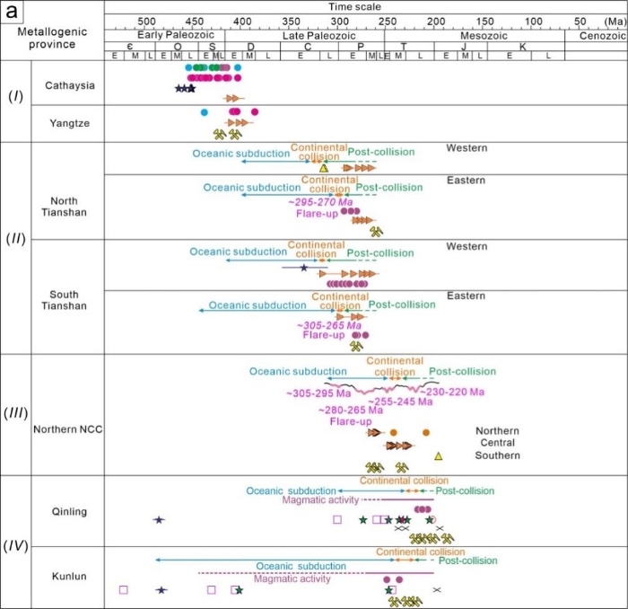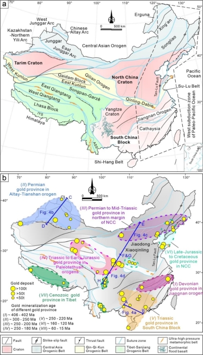 1、查明中国造山型金矿时空分布(图1和图2)。主要成矿省包括江南造山带泥盆纪金矿省、阿尔泰-泰山造山带二叠纪金矿省、华北克拉通北缘二叠-中三叠金矿省、古特提斯三叠-早侏罗纪金成矿省、华南板块三叠纪金成矿省、华北克拉通晚侏罗-早白垩纪金矿省和青藏高原新生代金成矿省。