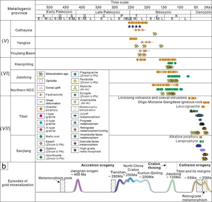 图2 (a)中国造山型金矿省成矿年龄与构造-岩浆-变质事件演化图;(b)中国主要造山型金矿成矿期