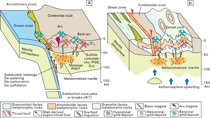 5、建立中国造山型金矿富集地幔活化成矿模型(图5)。成矿前期形成的富集岩石圈地幔,成矿期富集岩石圈地幔脱挥发份,含金流体沿着区域深大断裂运移并在不同成矿深度形成脉状和浸染状造山型金矿。该成矿模型是对经典地壳变质模型的补充,丰富了造山型金成矿理论。