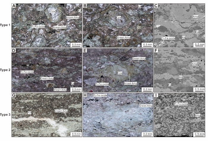 (2)作为交代辉长岩中的主要构成矿物之一,角闪石的主要变形机制为溶解-沉淀蠕变(Dissolution-precipitation creep)。正是由于角闪石的溶解-沉淀蠕变导致了流体交代与变形之间存在正反馈关系,从而形成富含具有强烈结晶学定向(Crystallographic preferred orientation;CPO)角闪石的交代辉长岩。
