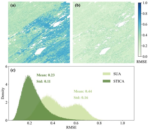 1.对比模拟数据发现,STICA LAI的RMSE均值从0.4下降到了0.23。