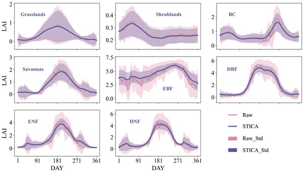 3.分析不同生物群落类型的LAI时间序列平滑性表明,STICA显著地降低了所有植被类型的噪声波动,尤其是常绿阔叶林;生成的LAI时间序列曲线比原始的MODIS LAI更符合预期的物候模式。