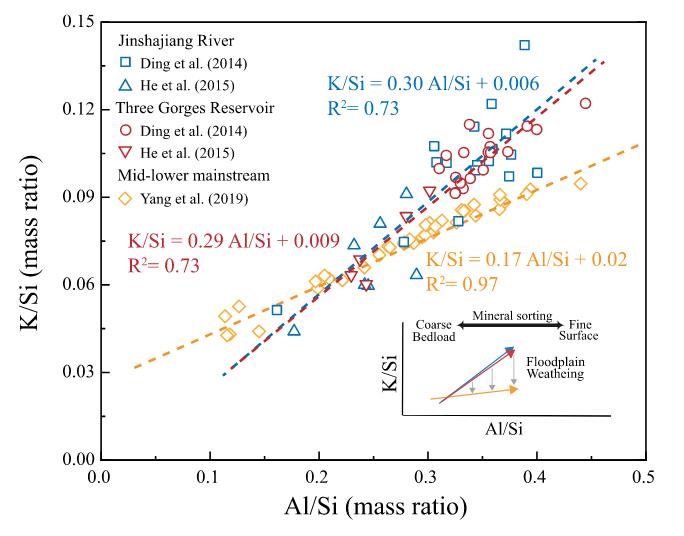 图2 长江悬浮物与沉积物中Al/Si与K/Si比值图