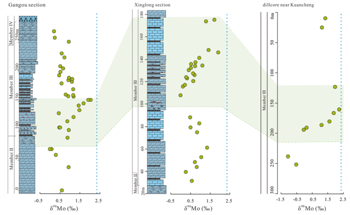 针对上述科学问题,我校“深时生命与环境演化”求真研究群体博士生徐东滔在导师王新强教授、史晓颖教授的指导下,与我校“金属同位素与壳幔物质循环”求真群体刘金高教授、秦政博士,科学研究院汤冬杰副教授,中国科学院广州地球化学研究所李杰研究员合作,对华北延庆干沟剖面以及兴隆剖面展开了钼同位素(δ98Mo)研究,取得了下述主要成果和认识: