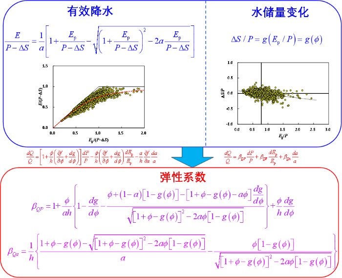 2、 流域径流量的弹性主要受流域下垫面特征控制,流域蒸散发的弹性由气候条件和流域下垫面特征共同控制(图4);