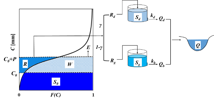 针对上述科学问题,我校水资源与环境学院韩鹏飞讲师与万力教授、王旭升教授以及美国北卡罗来纳州立大学、美国西北太平洋国家实验室的科学家联合开展研究,引入流域水储量变化和有效降水概念,改进Budyko模式并使用一个特定参数表征流域下垫面属性,推导出非稳定状态流域水文弹性系数的解析公式,将径流和实际蒸散发变化的弹性系数都表示为干旱指数、水储量变化和流域特征参数的联合函数(图1)。研究团队进一步使用改进的HyMOD流域水文模型(图2)模拟了美国78个湿润流域1979-2015年逐日的水文过程,得到逐年变化的非稳态流域水文通量数据,为本研究提出的弹性公式提供了验证数据(图3)。研究亮点如下: