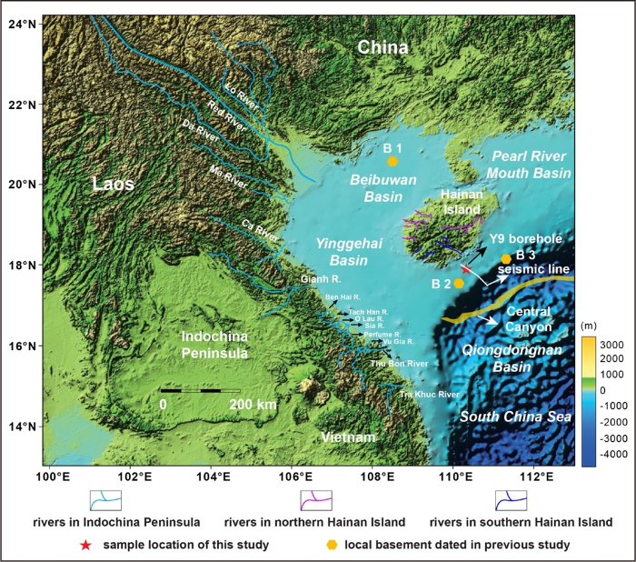 中国地质大学(北京)特任教授刘力与成都理工大学、德克萨斯大学奥斯汀分校、中海油湛江分公司、中国石油大学(北京)等机构的合作者,针对南海西北陆缘琼东南(图1)陆架,利用长达2500m,跨越3500万年的油气探井(图2)样品,采用锆石深度剖面LA-ICP-MS定年方法,取得了以下四点创新认识: