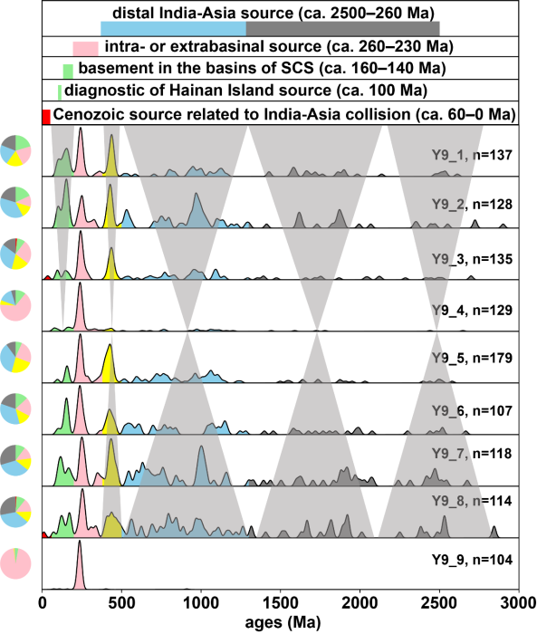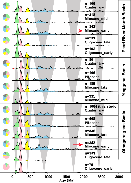 2、作者接着对北部湾盆地,莺歌海盆地和琼东南盆地中从渐新世到现今沉积物的碎屑锆石年龄进行统计,却发现了截然不同的变化趋势。自23Ma青藏高原东部开始快速隆生,三个盆地内都呈现出盆外物源的明显增加的变化趋势,且一直持续到当今(图4)。