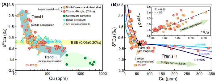 目前对陆壳和岛弧岩浆铜亏损的解释存在两种截然不同的模型:即富铜硫化物堆晶岩的拆沉和富硫岛弧地幔的低比例熔融。在地幔部分熔融过程中,不管熔融比例和源区硫含量如何变化,Cu同位素均不会发生分馏,相反,由于硫化物富集轻Cu同位素,硫化物的分异将导致熔体Cu同位素组成显著升高。因此Cu同位素是区分以上两种模型的最直接手段。