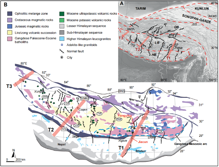 图 1. (A) 青藏高原区域地质图(标注为 T1 至 T3 的红色线条代表不同的撕裂,参考自: Li and Song (2018)。