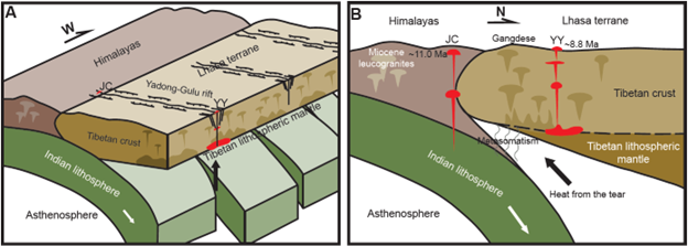 图 2. 构建的撕裂模型及藏南羊应(YY)和甲村(JC)岩石成因机制。