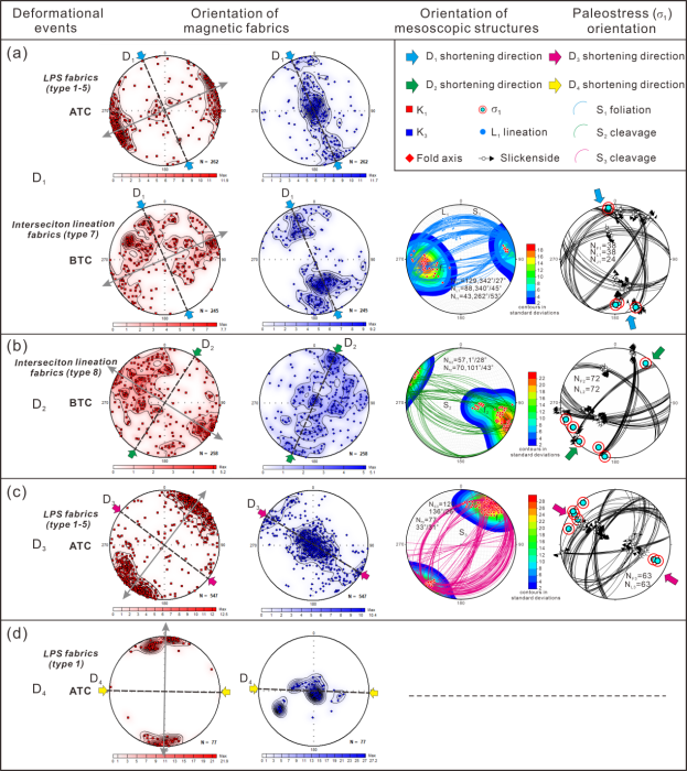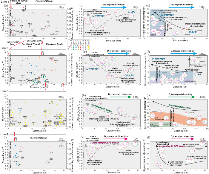 2. 顺磁性层状硅酸盐矿物是龙门山冲断带的主要载磁性矿物,少数抗磁性相和铁磁性相也对磁组构有贡献。主要发育LPS组构、交面线理组构和褶皱组构,磁线理方向以NE-SW向为主,ENE-WSW、NW-SE和近N-S向为辅。D1、D3和D4 变形的LPS应变演化表现为初始变形组构向铅笔状组构再到劈理组构的递进变化,分别对应中等扁圆形、扁长形和扁圆形的应变椭球体(图3)。此外,交叉线理组构还揭示了向腹陆方向由LPS组构向劈理控制组构的递进演变,以及新识别的D2期变形与D1期变形的非共轴叠加。D4期变形的LPS则以前陆盆地的初始变形组构为特征。