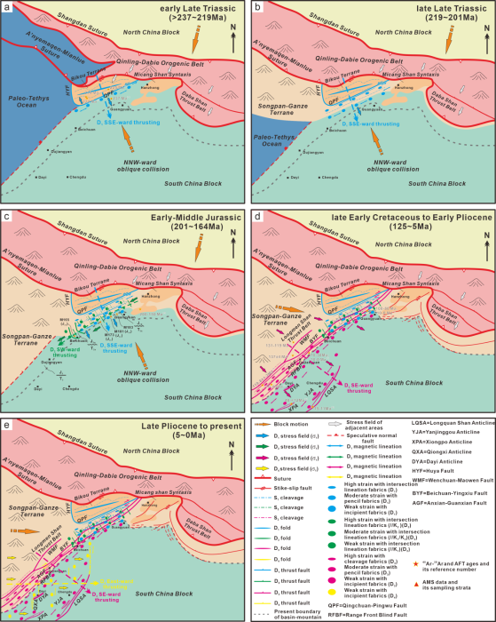 1. 龙门山冲断带记录了D1,D2,D3,D4四期变形(图2),包括龙门山北段>219~164 Ma指向SSE的逆冲(D1), 龙门山中北段>201~164 Ma指向SW的逆冲(D2),整个龙门山125~5 Ma指向SE的逆冲,以及5~0 Ma指向东的逆冲。