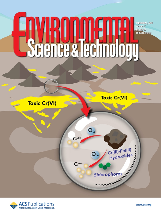 上述研究成果发表在国际权威期刊《Environmental Science & Technology》上,并被选为补充封面文章:Zhang D.L., Liu X.L.*, Ding, Y.F., Liu, J., Jiang, H.C., Dong, H.L.*, 2023, Enhanced Oxidation of Cr(III)-Fe(III) Hydroxides by Oxygen in Dark and Alkaline Environments: Roles of Fe/Cr Ratio and Siderophore. Environmental Science & Technology, 57, 13172-13181. [IF2022=11.4]
