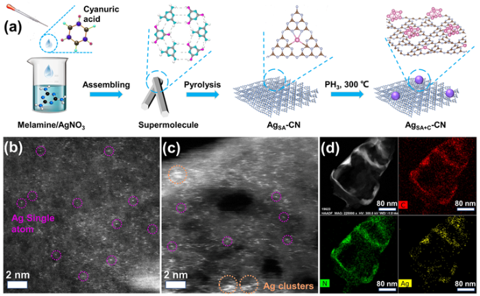 图1. (a) AgSA+C-CN制备示意图。 (b) AgSA CN和 (c) AgSA+C-CN的HAADF-STEM图像。 (d) AgSA+C-CN的EDS元素分布。