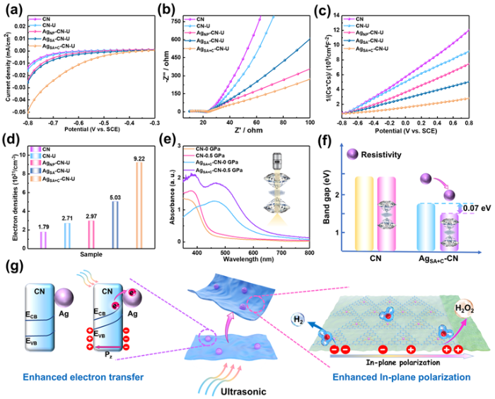 图3. (a) 电流密度-电压曲线, (b) 电化学阻抗谱, (c) 莫特-肖特基曲线以及 (d) 超声波下样品的计算电荷密度 (U)(e) HP-DRS和(f) CN和AgSA+C-CN的带隙变化。(g) 压电催化过程的原理图。