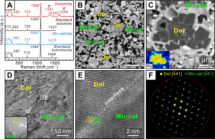 图3 碳酸锰矿物以微生物成因白云石为模板生长现象的矿物学特征