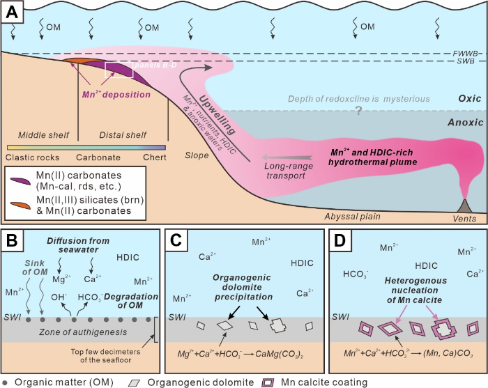 锰不仅是重要的战略性关键矿产,而且对水体氧化还原状态的变化十分敏感,这使得沉积型锰矿床逐渐成为反映大洋氧化历史的重要指标之一。传统观点认为碳酸锰矿物的沉淀需经历氧化锰的中间阶段,代表了富氧的底层海水。近年来有研究者提出碳酸锰矿物也可以在Mn2+浓度极高的缺氧海水中直接沉淀。上述模型均针对局限的盆地或者湖泊环境中的碳酸锰沉淀过程,仅能反映局部水体的氧化还原状态。碳酸盐岩型锰矿床常发育在与大洋连通的开阔陆棚环境中,碳酸锰矿物的沉淀过程与已有模型不同,该类型矿床可能指示了区域或全球性海水氧化还原状态的变化。因此,查明其成因对探究大洋氧化历史有重要科学意义。