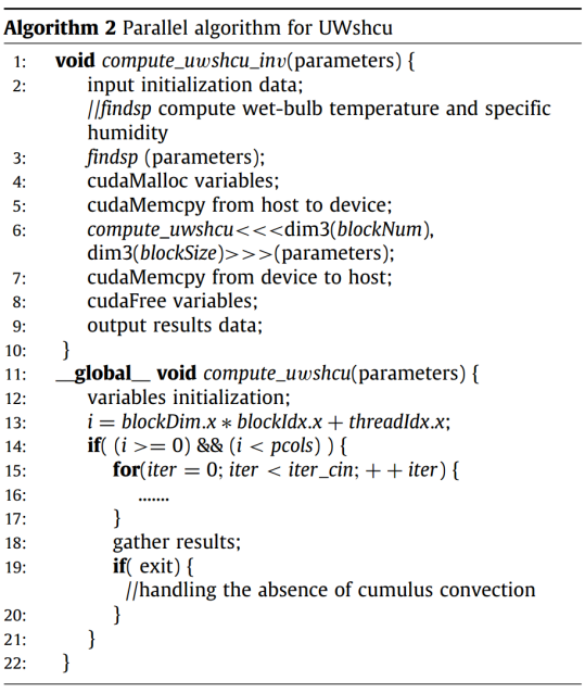 2. 基于MPI+CUDA和MPI+HIP混合并行编程模型来加速UWshcu。该异构加速算法能够利用超算多GPU的优势,满足高分辨率气候模型对大规模计算资源的需求。