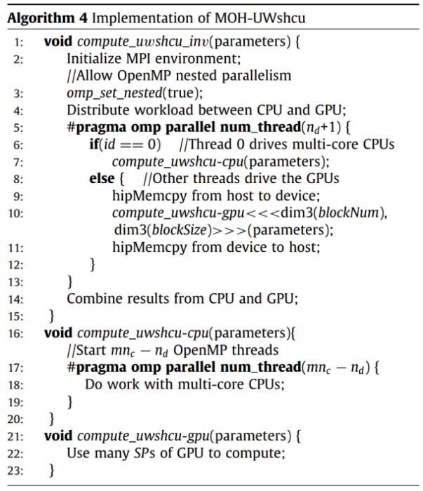 3. 通过MPI+OpenMP+HIP(MOH)三级混合并行编程模型进一步优化了UWshcu的异构算法,实现了节点内计算资源的充分利用。此外,提出了一种合理划分CPU和GPU计算负载的算法,可以最小化UWshcu的计算时间。