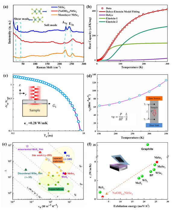 针对以上问题,我校数理学院青年教师孙瑞锦联合中科院物理所、华中科技大学以及剑桥大学卡文迪许实验室团队,设计并合成了一种由NbSe2和高多孔氢氧化物层交替组成的特殊超晶格,并证明了在此块体材料中实现层间的完全解耦。具体表现在实验上,超晶格(NaOH)0.5NbSe2沿层间方向呈现出理想的一维电绝缘状态,这表明NbSe2层之间实现了完全的电子解耦合。振动(声子)的解耦合则表现在拉曼光谱中的层间振动模式峰消失、比热容以爱因斯坦局域模式为主导、层间极低的结合能(接近石墨烯级别)以及极低的层间热导率(0.28 W/mK,约为NbSe2 的百分之二)。以上层间的解耦合特性导致(NaOH)0.5NbSe2呈现出了与单层NbSe2几乎完全相同的物理特性(文中以超导和电荷密度波有序为例),在体材料中实现了真正的二维化。