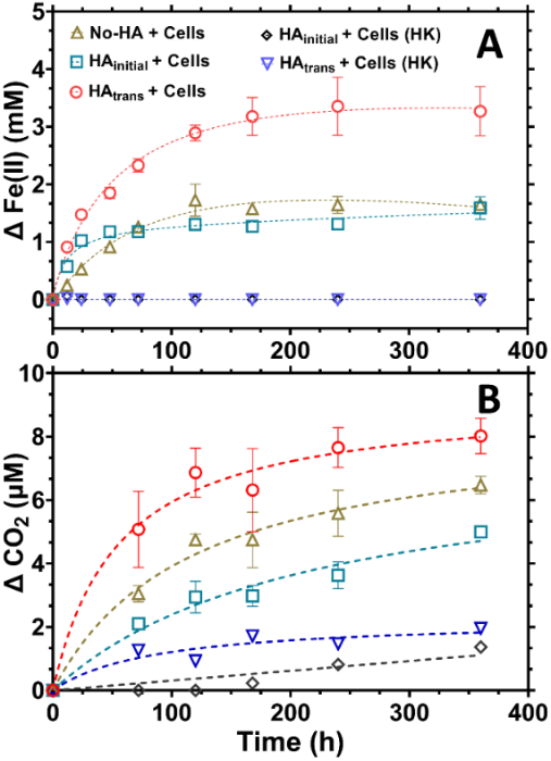 图2. (A)仅存在腐殖酸作为电子供体时,绿脱石层间结构Fe(III)还原随时间的变化;(B)CO2随时间的累积量